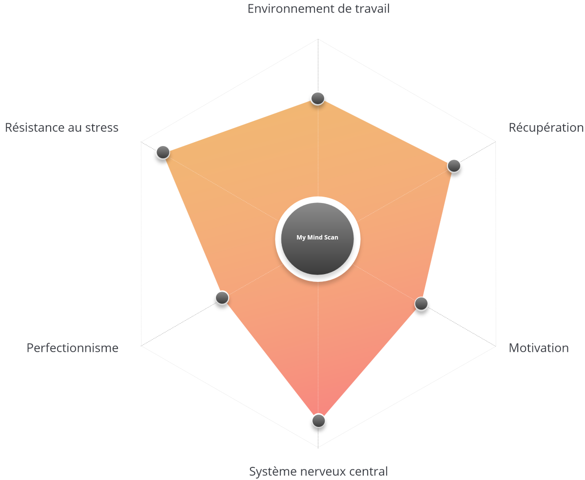 In just 20 minutes of testing, each individual can assess his or her well-being in an objective way that has been validated by the scientific community. The scan will then propose a diagram according to 6 categories: Work Environment, Recovery, Motivation, Central Nervous System, Perfectionism and Stress Resistance. (see graph) Thereafter, it is possible to call upon professional mental wellness coaches and to follow the evolution via a personalized dashboard.